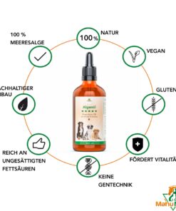 Das Algenöl hat eine hohe Konzentration und aus diesem Grund reichen nur wenige Tropfen für Deinen Vierbeiner. Unser Algenöl ist in Deutschland hergestellt. Nachhaltige Glasfalsche und Glaspipette sowie eine nachhaltige Produktion sprechen für das Algenöl.