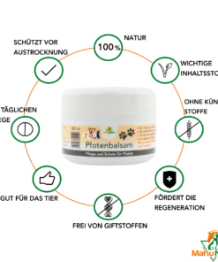 Die Pfoten und die Zehenzwischenhaut mehrmals täglich mit Mahu Natur Pfotenbalsam einreiben. Im Winter und an heißen Sommertagen die Ballen vor dem Spaziergang großzügig mit dem Balsam einreiben. Bei rissigen und trockenen Pfoten – Bei starker Beanspruchung – Fördert die Regenaration – Zur täglichen Pflege! Mit wertvollen Bienenwachs (Pfotenwachs) für eine hervorragende Ballenpflege.